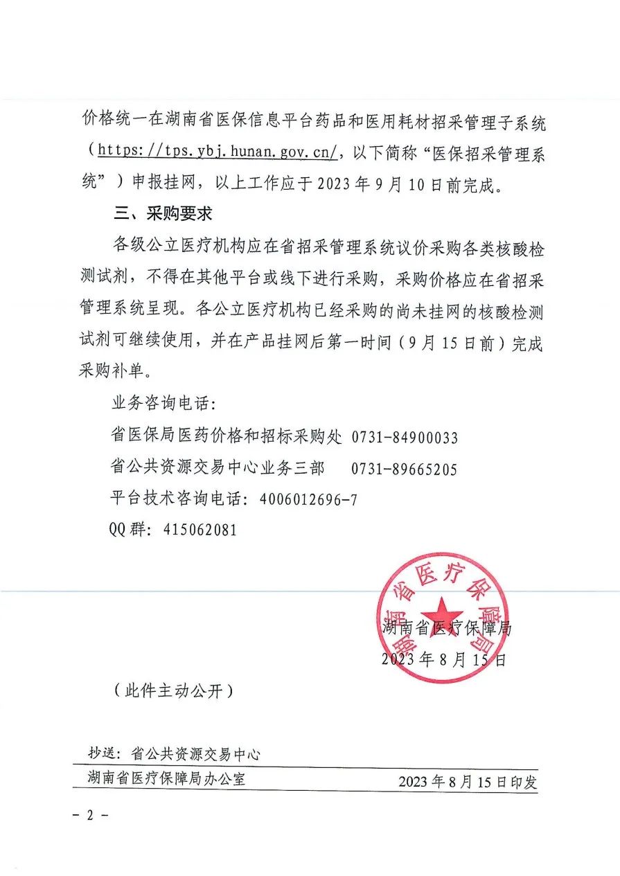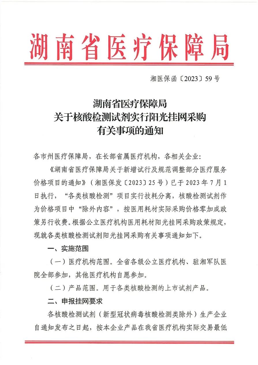 2023年8月16日,湖南省醫(yī)保局發(fā)布《關(guān)于核酸檢測(cè)試劑實(shí)行陽光掛網(wǎng)采購有關(guān)事項(xiàng)的通知》,要求相關(guān)生產(chǎn)企業(yè)將用于各類核酸檢測(cè)的上市試劑產(chǎn)品(新型冠狀病毒核酸檢測(cè)類除外)于2023年9月10日前,以湖南省醫(yī)療機(jī)構(gòu)實(shí)際交易最低價(jià)在湖南醫(yī)保招采管理系統(tǒng)申報(bào)掛網(wǎng)。