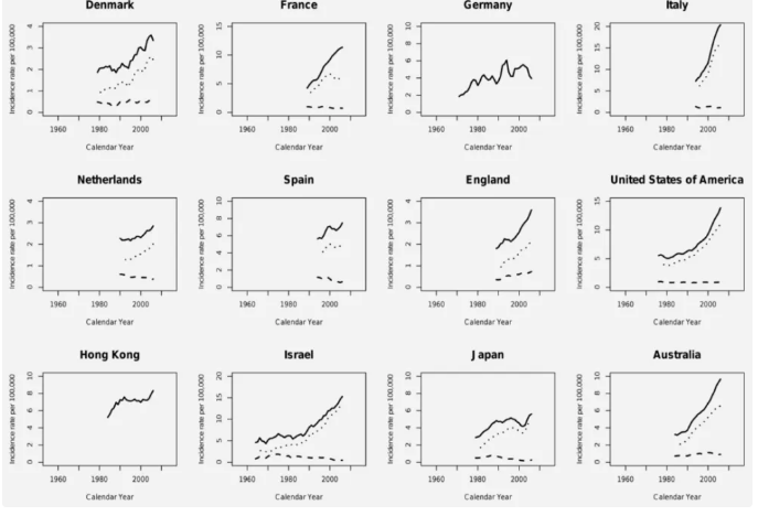 1960 年至 2007 年,在不同國(guó)家和地區(qū),男性甲狀腺癌發(fā)病率的總體趨勢(shì)呈明顯上升,圖片來源:參考文獻(xiàn)[4]