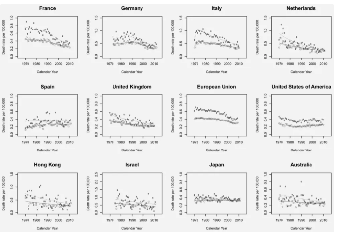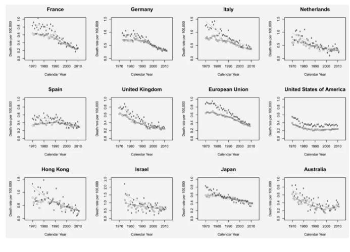 1970 年至 2012 年,在不同國(guó)家和地區(qū),女性甲狀腺癌死亡率穩(wěn)定下降,圖片來源:參考文獻(xiàn)[4]
