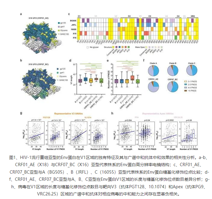 研究團隊首先利用單分子冷凍電鏡技術(shù)與生物大分子質(zhì)譜全面揭示了CRF01_AE和CRF07_BC代表型株系的Env蛋白結(jié)構(gòu)與糖基化修飾(圖1a-c)。隨后從上述研究中獲得的線索出發(fā),對當(dāng)前數(shù)據(jù)庫中六千余條不同亞型的Env蛋白的V1區(qū)域進行了跨亞型對比和分析。結(jié)果顯示,相比于其他亞型,CRF01_AE亞型的V1區(qū)域長度顯著增長(圖1d),且糖基化修飾位點數(shù)目顯著增多(圖1e-f)。進一步對中和實驗數(shù)據(jù)和V1區(qū)域特征的關(guān)聯(lián)分析則顯示CRF01_AE亞型在V1區(qū)域的上述特征會明顯削弱兩類廣譜中和抗體(分別靶向Env蛋白的apex與V3區(qū)域)對CRF01_AE亞型的中和效果(圖1g-h)。上述研究結(jié)果提示,應(yīng)盡量避免在CRF01_AE亞型的流行區(qū)域開展靶向Apex或V3區(qū)域的免疫聚焦型疫苗或廣譜中和抗體的臨床試驗。