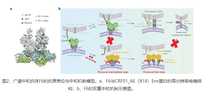 F6是第一株分離自CRF01_AE感染個體的廣譜中和抗體。研究團隊還通過高分辨率冷凍電鏡結(jié)構(gòu)解析揭示了F6在Env蛋白上的詳細(xì)抗原表位(圖2a),并進一步通過結(jié)構(gòu)分析與功能實驗驗證闡明了F6的新型中和機制(圖2b):F6一方面通過變構(gòu)效應(yīng)擾動Env蛋白三聚體Apex區(qū)域的穩(wěn)定性,破壞Env蛋白與宿主CD4受體的結(jié)合,另一方面通過誘導(dǎo)三聚體的解體來阻礙Env蛋白介導(dǎo)的病毒包膜與細(xì)胞膜的融合,進而抑制病毒對于宿主的入侵(圖2b)。