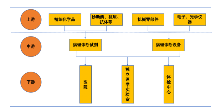 病理行業(yè)產(chǎn)業(yè)鏈包括上游原料市場、中游試劑設(shè)備市場和下游需求診斷市場。原料包括生物與化學(xué)原材料以及各種機(jī)械零配件,分子病理還會涉及到引物、探針等;中游包括病理診斷試劑和病理診斷儀器;下游需求主要來自于醫(yī)院、第三方獨(dú)立醫(yī)學(xué)實(shí)驗(yàn)室、體檢中心、政府等。