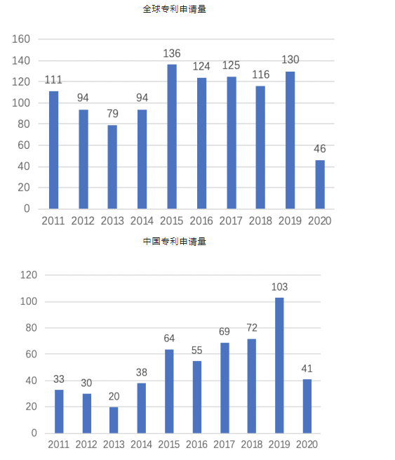 上圖所示為以“病理診斷”和“細(xì)胞病理”進(jìn)行全球檢索得到的近10年的專利申請情況。從圖中可以看出,病理診斷領(lǐng)域近10年約有1055件專利申請(由于發(fā)明專利有18個(gè)月公開的滯后期,實(shí)用新型從申請到公開也需一段時(shí)間,因此2019年和2020年數(shù)據(jù)有所偏差),其中發(fā)明專利604件、實(shí)用新型專利179件。從圖2中可以看出,全中國病理診斷領(lǐng)域近10年約有525件專利申請(由于發(fā)明專利有18個(gè)月公開的滯后期,實(shí)用新型從申請到公開也需一段時(shí)間,因此2019年和2020年數(shù)據(jù)有所偏差)。
